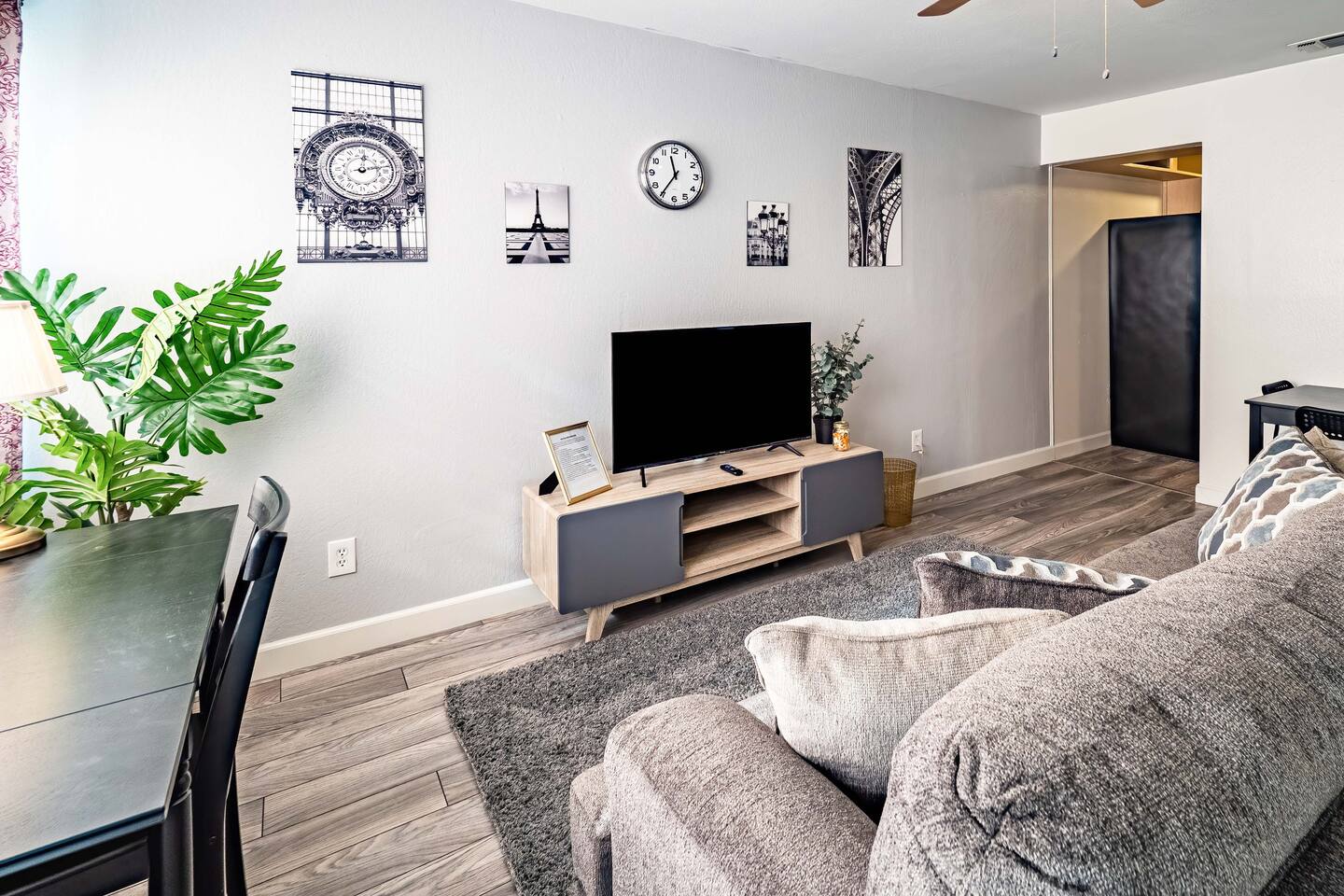 We offer Netflix and Disney+ on each television. Please note that we have installed a security camera at the front door, pointed outside for security purposes, and a NoiseAware device inside the home to monitor noise levels. The NoiseAware device is not intended for recording, and please be assured that we cannot hear any audio from it. Please kindly check additional reminders for the property and note that these are for STRICT IMPLEMENTATION. • No pets. • No smoking, vaping, or use of marijuana at anytime anywhere on the property including apartment complex. The apartment complex has No Smoking rules as well. Because other tenants are smoking does not grant permission. We are providing housing through a corporate lease, being 100% compliant is imperative. No smoking, no cigarette butts littering, no rubbing out burning cigarette tips, and no flicking cigarette ashes anywhere on the property, including the apartment complex. Please smoke on the street. • No parties, events, birthdays, bachelor or bachelorette stays, get-togethers, hangouts and the like. • Check-in is anytime after 4 PM and check-out by 11 AM. • Self-check-in with a smart lock. • Do not disrespect your neighbors. • Do not wash dishes in the bathroom sink. • Do not burn candles, incense, or any other open flames. • We do not allow personal mail deliveries to our property. We can only allow Amazon package deliveries. • Lock the door AT ALL TIMES. We want you and your things to be safe. • Do not have more guests than stated in your reservation and do not have any unapproved visitors. • No loud music or disturbances, especially noise past 10 pm. • Please note that excessive internet data usage will result in a fee of $50 if it goes over the limits of our plan. • If you open it, close it; if you borrow it, return it; if you turn it on, turn it off; if you break it, fix it; if you use it, look after it; if you make a mess, clean it up; and if you move it, replace it. NOTE: We are not responsible or liable for any accidents, injuries, or illnesses that occur while on the premises. We are not responsible for the loss of personal belongings or valuables during your stay. We cannot be responsible for any items left behind. • FEES: A lost remote control (TV, fan, or air conditioner) will result in a $100 charge. • FEES: A $250 fine will be imposed for any type of smoking. • FEES: Unapproved Late Check-Out fees: Every hour after 11 a.m. is an additional $50. • FEES: Additional guests not listed in your reservation will be charged $50 per night per person. Please be completely transparent in your reservation so that you can avoid this issue. • FEES: A $250 fee will be assessed for blocking or covering entrance surveillance cameras. •Toiletries provided in the bathroom are intended for initial use only. These items are meant to serve as a startup kit to get you settled in upon your arrival. For longer stays or if you require additional supplies, we kindly ask that you make the necessary arrangements to purchase these items as needed.